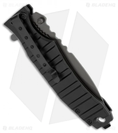 The Black Bomber knife is a spring assisted folder with a sleek look. Just give the flipper or thumb stud a push to deploy the spear point style blade; it is Ti-Nitride coated giving it a non-reflective gray finish. The handle sports grooved black aluminum scales over the steel liner and lock tab. The Bomber is fitted with a chisel/screwdriver pommel and deep-carry tip-down steel pocket clip.